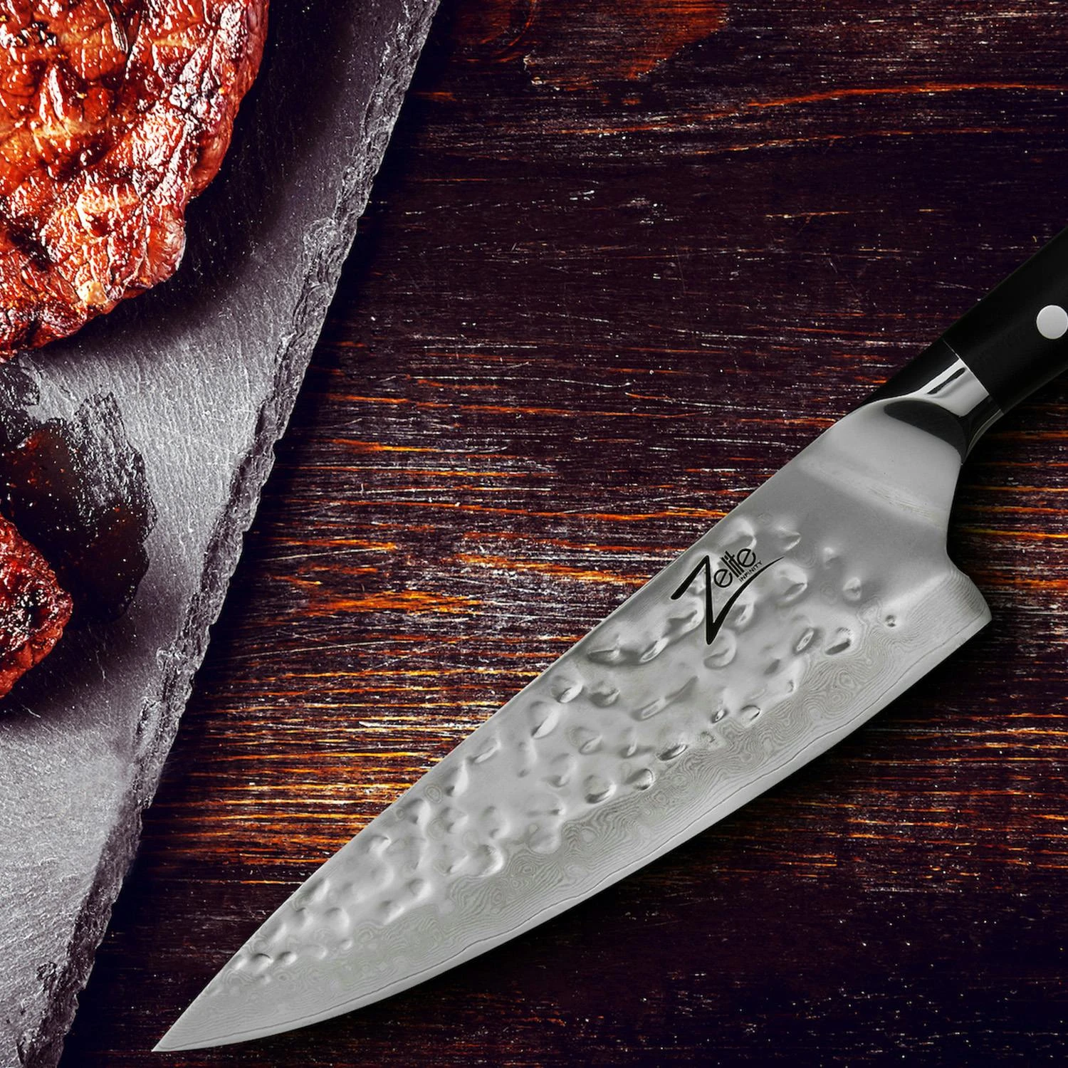 Das 8` Chefkochmesser der Alpha-Royal Japanese Serie von Zelite Infinity by Klarstein ist eine Weiterentwicklung unseres ursprĂŒnglichen Kochmessers. Wir haben unser gehĂ€mmertes Tsuchime-Finish ĂŒber das bereits atemberaubende Damaszener-Muster gelegt, was dem Messer noch mehr Stil und Klasse verleiht. Als eines der vielseitigsten Messer in deiner KĂŒche ist dieses Kochmesser rasiermesserscharf und hat mit 57 mm eine breitere Klinge als dein Standard-Kochmesser. Es ist ideal zum Schneiden von Fleisch, WĂŒrfeln von GemĂŒse, Zerteilen von Obst, Zerkleinern von KrĂ€utern, Hacken von NĂŒssen und vielem mehr – ein unverzichtbares Werkzeug in deiner KĂŒche.