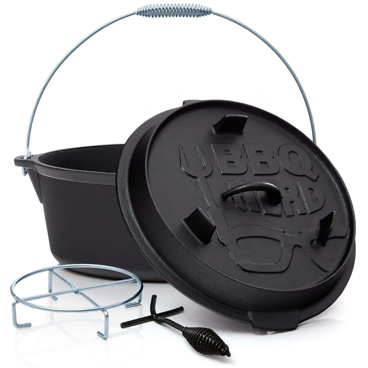 - DUTCH OVEN PREMIUM SET – Der feuerfeste Topf aus robustem Gusseisen ist ein Allrounder zum Kochen, Backen, Braten, Schmoren und Garen! Du kannst den Dutch Oven ins offene Feuer stellen, über dem Lagerfeuer aufhängen oder auf dem Grillrost benutzen.