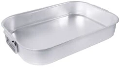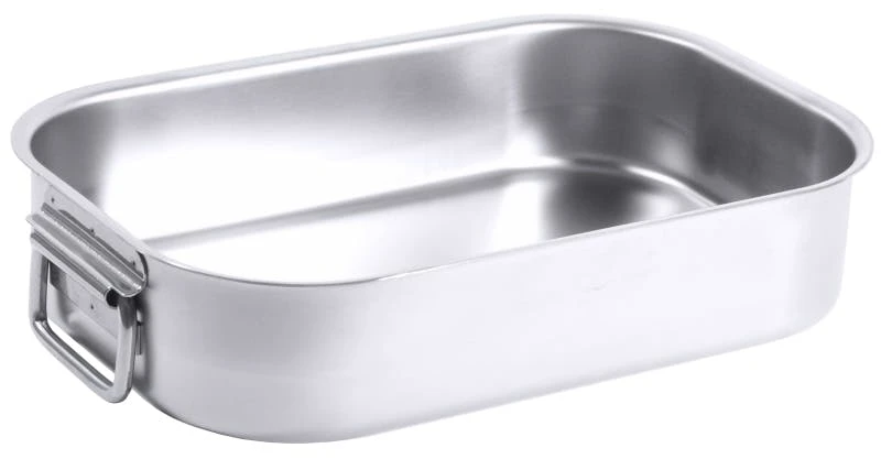 Bratpfanne, rechteckig, aus 1,5 mm starkem Edelstahl 18/10, seidenmatt poliert, schwere QualitĂ€t, mit Fallgriffen. Ohne Kompensboden, daher nur fĂŒr den Backofen geeignet!
