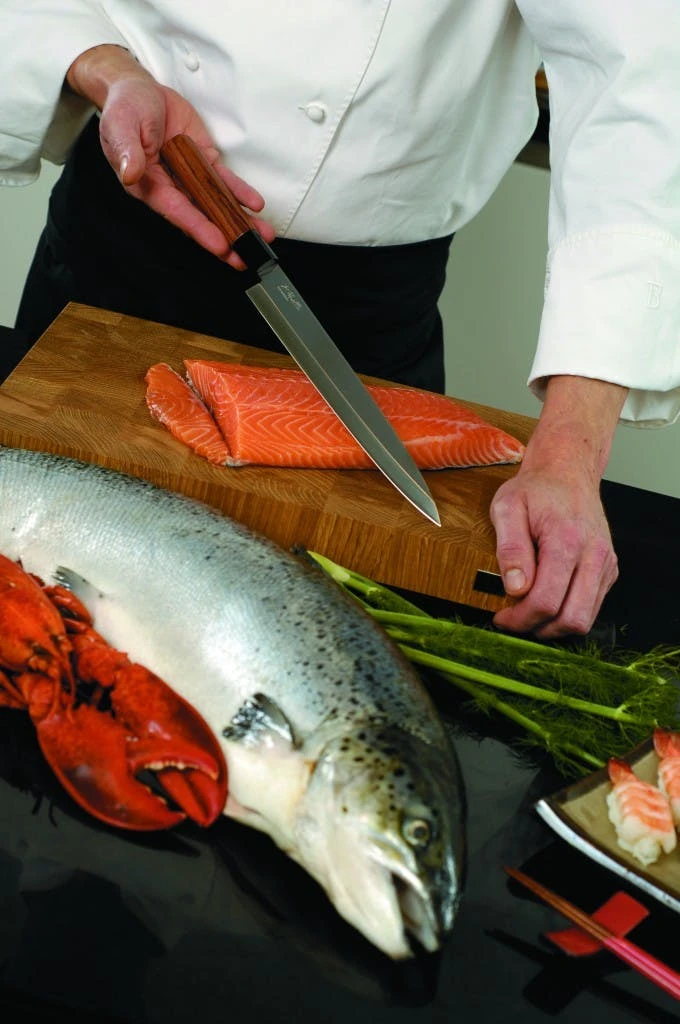 Das KAI Seki Magoroku Red Wood Yanagiba MGR-210Y ist ein einseitig geschliffenes Sushi-Messer (Yanagiba) und wird zum Beispiel beim Schneiden von Sushi- und Sashimi- Scheiben verwendet. Die kleineren Klingen eignen sich gleichermaßen als Hilfsmesser, z.B. zum Schneiden von Kleingemüse. Die Messergröße sollte der Größe der vorzubereitenden Zutaten entsprechen. Beim KAI Seki Magoroku Red Wood Yanagiba MGR-210Y handelt es sich um ein Messer mit einer Klingenlänge von 21 cm. Ideal für größere Fisch- oder Fleischstücke.