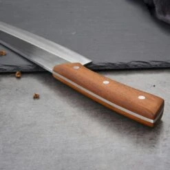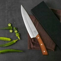 Das Chefmesser aus 4Cr13 Edelstahl ist mit einem minimalistischen Stil versehen. Die zunächst Breite 20,7 cm lange Klinge verläuft traditionell zu einer dünnen Spitze aus. Der ergonomische Griff besteht aus schlichtem Naturholz. Dank ihrer langen scharfen Klinge können Sie von großen Fleischstücken bis hin zu feinsten Kräutern alles schneiden. Der leicht gebogene Holzgriff liegt wunderbar in der Hand und bietet ein komfortables und leichtes Schneidegefühl. Mit dem KEMP&ECKE Edelstahl-Chefmesser mit einem Härtegrad von 58 HRC entscheiden Sie sich für ein stabiles als auch schlichtes Messer, das Ihre Arbeit in der Küche erleichtern wird. NATURHOLZGRIFF Der Griff besteht aus schlichtem Naturholz und ist ergonomisch sehr gut verarbeitet. Der Griff ist leicht gebogen und liegt super in der Hand. TRADITION Mit der traditionell Klinge, die zunächst breit ist und dann zur Spitze hin dünn ausläuft, haben Sie das perfekte Chefmesser für die Verarbeitung von Fisch, Fleisch und Gemüse. Die Klinge ist sehr scharf und schneidet präzise. EDELSTAHLKLINGE Die Klinge besteht aus 4Cr13 stabilem Edelstahl und hat eine wunderschöne schlichte Optik. IHR PERFEKTES CHEFMESSER Sie wollen ein schlichtes Küchenmesser, das seinen Job erledigt? Dann ist das Chefmesser mit breiter Klinge Ihre Wahl. Es hat einen minimalistischen Stil und erfüllt vollständig seinen Zweck: Es gibt Ihnen ein komfortables Schneidegefühl und erleichtert Ihre Arbeit in der Küche. Das Chefmesser ist im Preis-Leistungs-Verhältnis grandios. SCHARFE KLINGE Dicke: 3,0 mm Gesamtlänge: 33 cm Klingenlänge: 20,7 cm Klingenbreite: 5,1 cm Gewicht: 269g NATURHOLZGRIFF Klingenmaterial: Edelstahl 4Cr13 Griff: Naturholz Muster: Matt Finish Härtegrad: 58 ±2 DAS PERFEKTE GESCHENK Sie wollen Ihren Liebsten ein tolles und preiswertes Messer schenken? Dann kaufen Sie das Chefmesser aus Edelstahl und machen Sie ihnen eine Freude