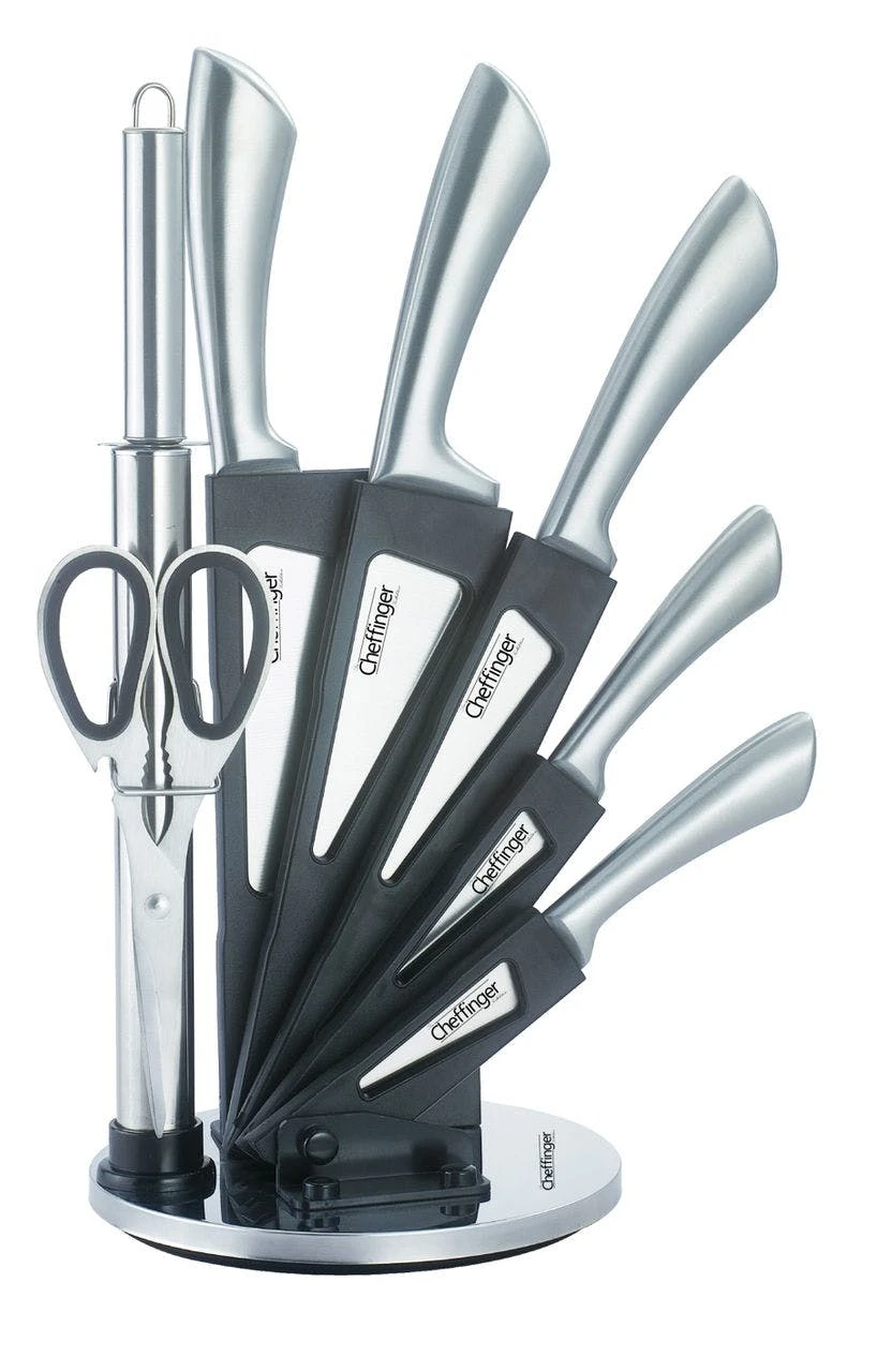1 x Messerblock, 1 x EdelstahlfuĂź, 1 x Schrauben, mehrsprachige Bedienungsanleitung