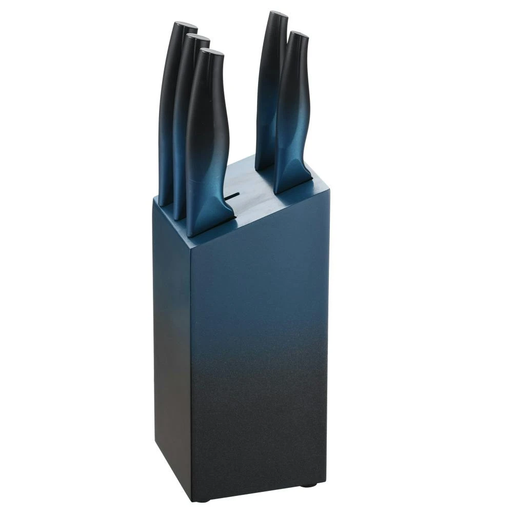 6-teiliges Messerset mit Klingen aus antihaftbeschichtetem Edelstahl und Griffen aus Kunststoff. Set beinhaltet: Kochmesser (Länge 20 cm, Dicke 1,5 mm), Brotmesser (Länge 20 cm, Dicke 1,5 mm), Fleischmesser (Länge 20 cm, Dicke 1,5 mm), Universalmesser (Länge 15 cm, Dicke 1,2 mm), Gemüsemesser (Länge 9 cm, Dicke 1,2 mm) und Schäler (Länge 9 cm).